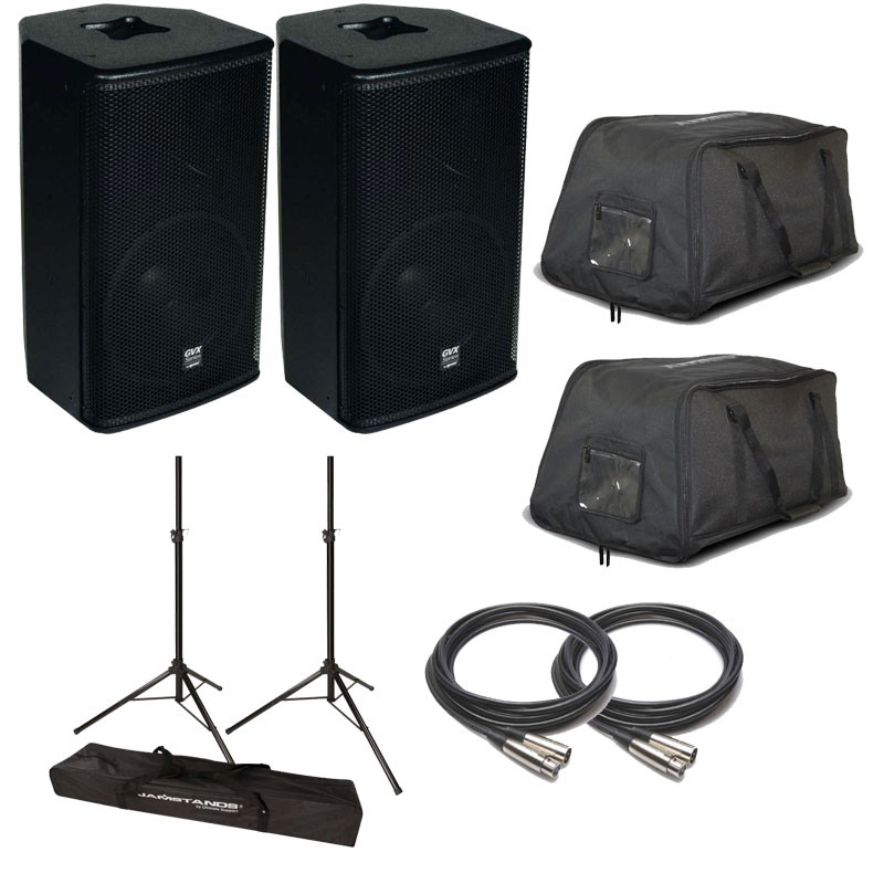 This Gemini bundle includes (2) Gemini GVX12P Powered Speakers, (2) Ultimate Support Jamstands speaker stands, (1) Speaker Stand protective carrying bag, (2) protective speaker bags and (2) 25' XLR-XLR powered speaker cables.