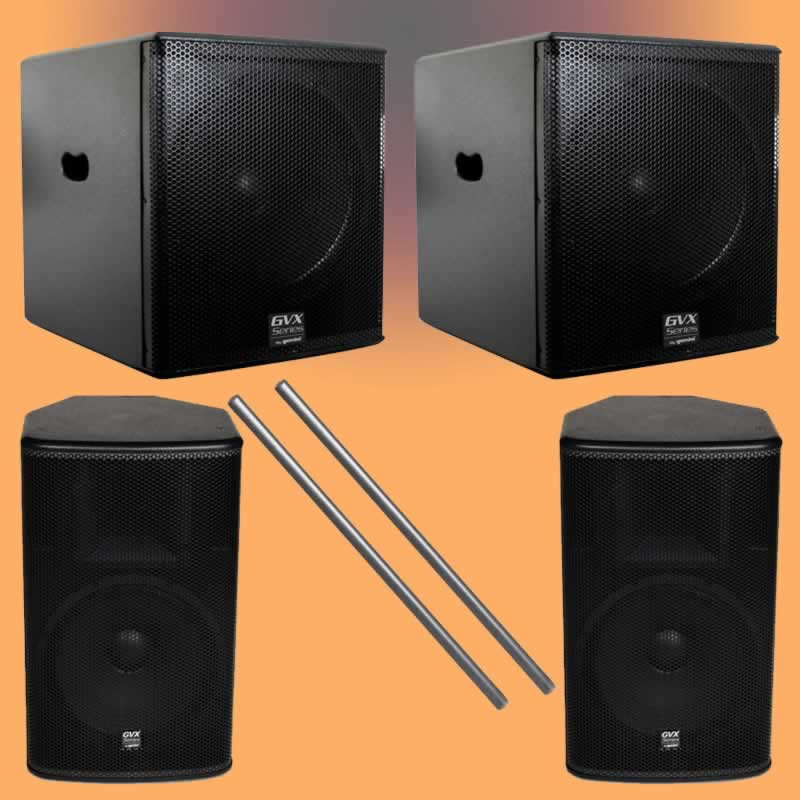 Package Includes: (2) GVXSUB15 Subwoofers, (2) GVX15P Speakers, (2) FREE Speaker Poles and all connecting cables...