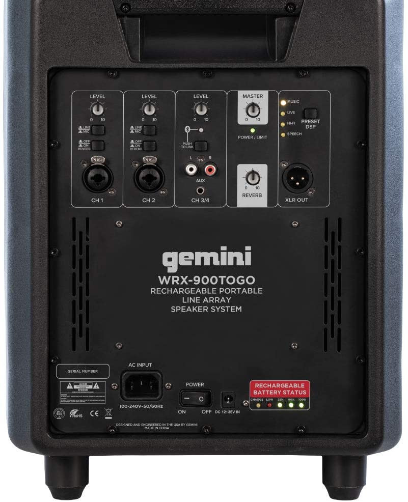 Endless Audio & Mixing OptionsThe playback possibilities are endless. The WRX-900TOGO features 4 input channels for line/mic with variable level and reverb. The Professional Audio Column Array features multiple DSP modes (music, live, hi-fi, and vocal) and a subwoofer unit houses with controls for master volume, line input, and mic input. Sound will always be crystal clear no matter how hard your speaker rocks.