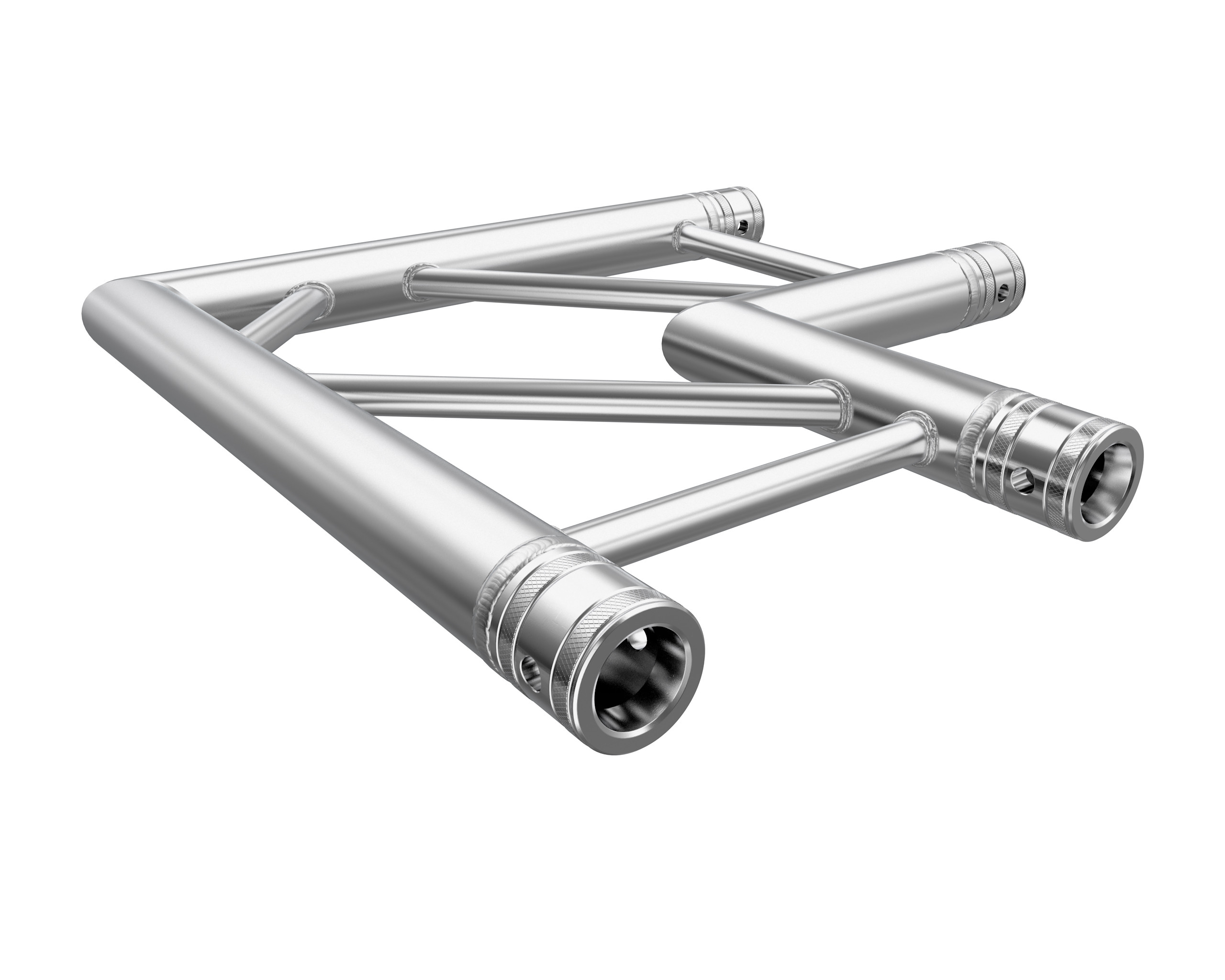 1.64ft. (0.5m) F32 2-way 90 degree horizontal corner. The F32 truss series by Global Truss is a TV approved 2-point system with an external dimension of 29cm. Grid constructions for exhibition stands or permanent installations are possible with this system. Short outrigs or cross ways with little loads can also be created. As a grid a maximum span of up to 10 meters can be used. Fabricated by certified TUV welders. Equipped with connecting hardware.