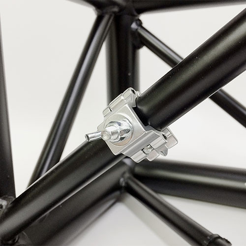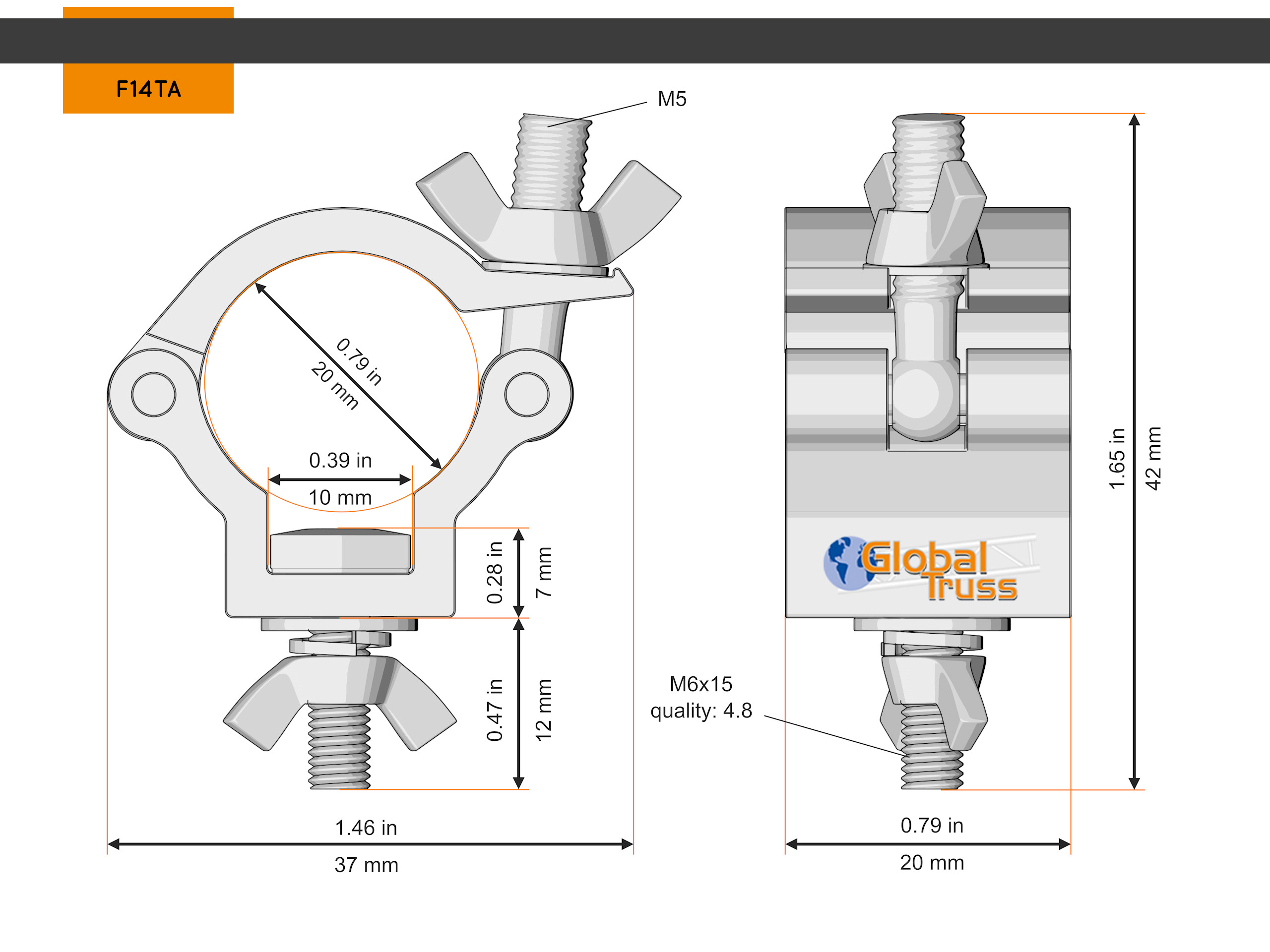 The Global Truss Mini 360 F14 is a light duty clamp, capable of holding up to 22lbs of weight. The clamp is a wrap-around clamp that can handle tube sizes between 18mm and 20mm. It will also wrap around the diagonal cross bars of F32, F33, and F34 trussing.