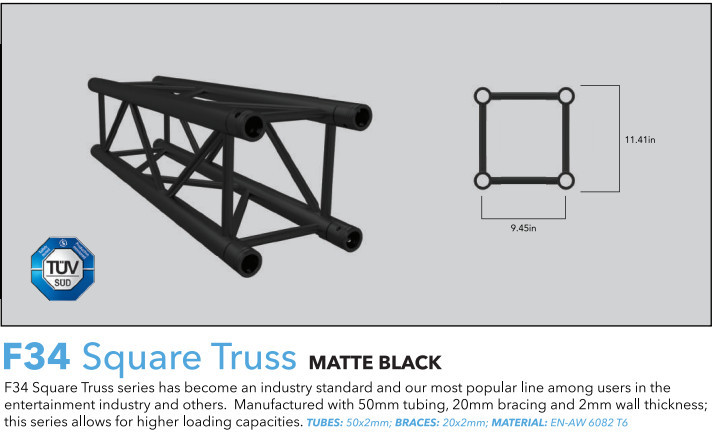 The F34 Square Truss series has become an industry standard and our most popular line among users in the entertainment industry and others. Manufactured with 50mm tubing, 20mm bracing and 2mm thick wall thickness, this series allows for higher loading capcities. An excellent choice for live stages, theaters, night clubs, church installations, touring companies, production houses, rentals and tradeshow designers.