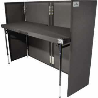 The AT-6022 table top measures 60" wide by 22" deep. There is a port hole conveniently installed for cable feed through. With the legs collapsed, it is easily carried with the steel reinforced strap handle. The smooth black carpet finish and durable plastic corners will help protect your gear.