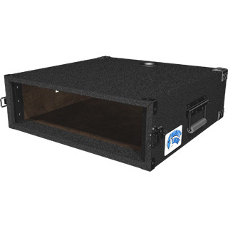 The MLD-03 has 3 rack spaces (5.25") with heavy duty rack rail bolted in for more secure mounting. It comes standard with a front lid with padlockable surface latches and a rear pressure fit cover with a port hole for cable feed and easy removal. Two surface mounted spring style handles and black plastic corners are also standard equipment.
