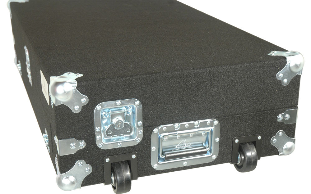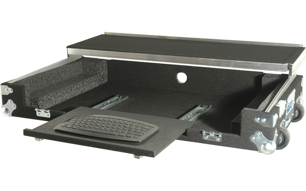 A front removable panel allows access to the front connectors while also providing protection during transport. There is an open compartment under the controller to allow for proper ventilation. Space in the back of the case allows for rear connectors and cable storage. The glide track' system allows the laptop tray to slide back to a comfortable operating position. There is also a pull-out tray at the bottom of the case.