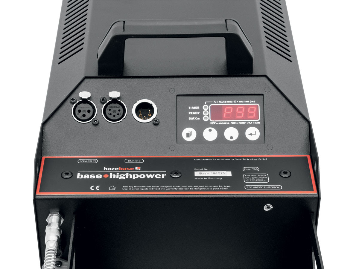Neatly designed with an extremely powerful output is the key to this units long standing touring reputation. This unit also includes all the features of the base classic with twice the wattage. The base highpower reaches operation in less than 7 minutes. It can be controlled via DMX using only one channel or built in onboard timer. Wired and wireless controllers are also available. Base Classic water-based fluid is designed for any environment. From a quick dissipation to a dense fog that will hang in the air. The unit can run continuously at 50%.