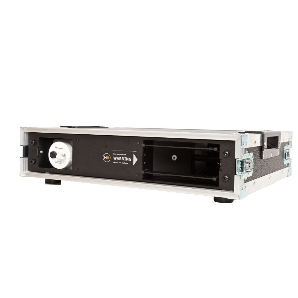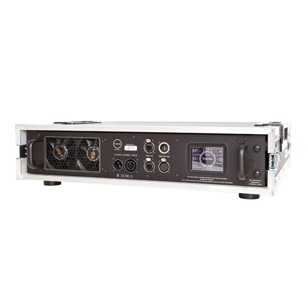 THE FAB is mounted in a 19" roadcase with 2U. The 1000ml fluid tank lasts from about 150 hours at minimum settings to 3 hours at maximum output.