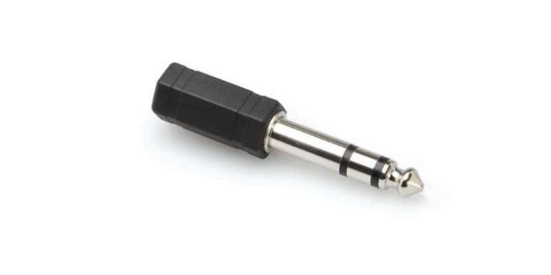 Stereo headphone adaptor converts 3.5mm plug to 1/4 inch plug. Used when plugging walkman-type headphones into DJ mixers or home stereos.