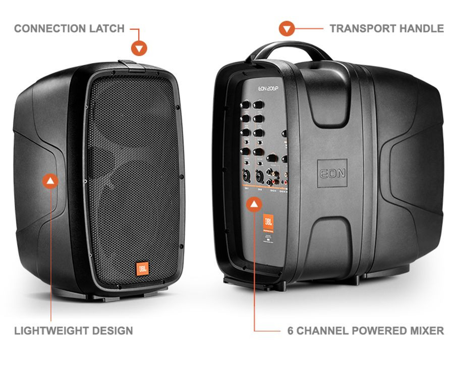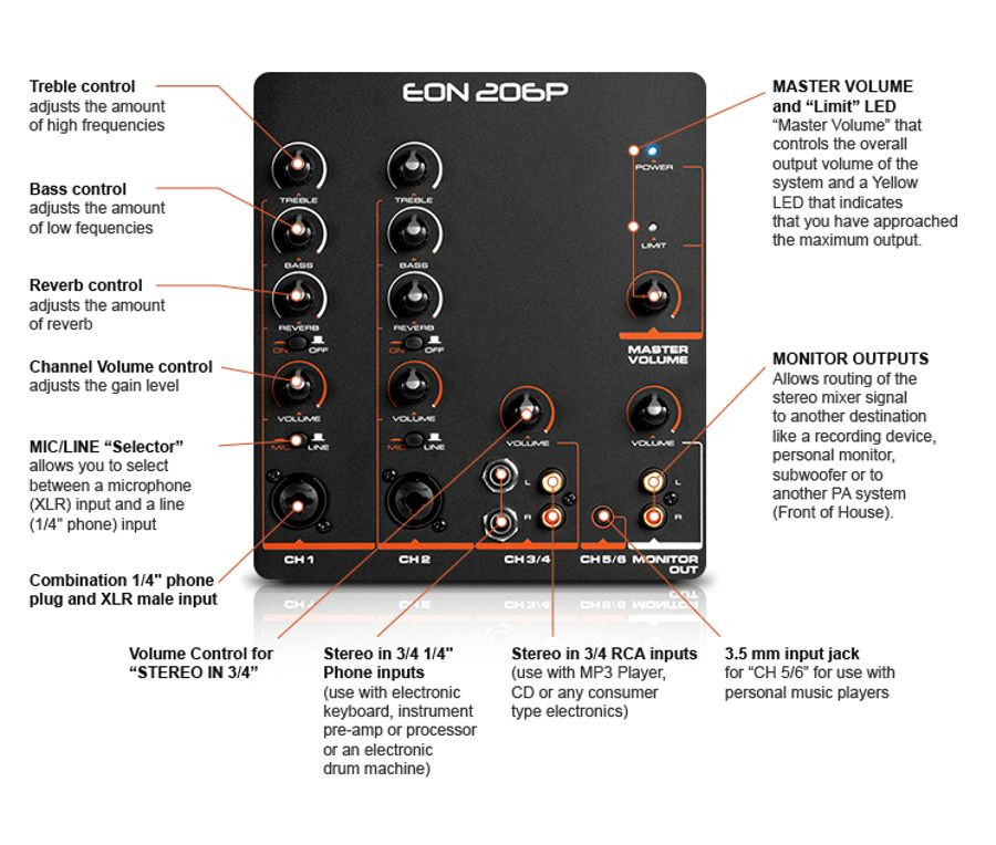 The EON206P is a self-contained, portable PA system featuring multiple input channels with individual tone controls, reverb and convenient sound output capabilities that allow the user to integrate the system into any number of audio environments. With its lightweight and ergonomic design, the EON206P is an easy to use, lightweight package with un-compromised sound quality. Whether you're a musician, singer, DJ, teacher or anyone in need of a truly compact and portable system, the EON206P has all the features you need to deliver your message.