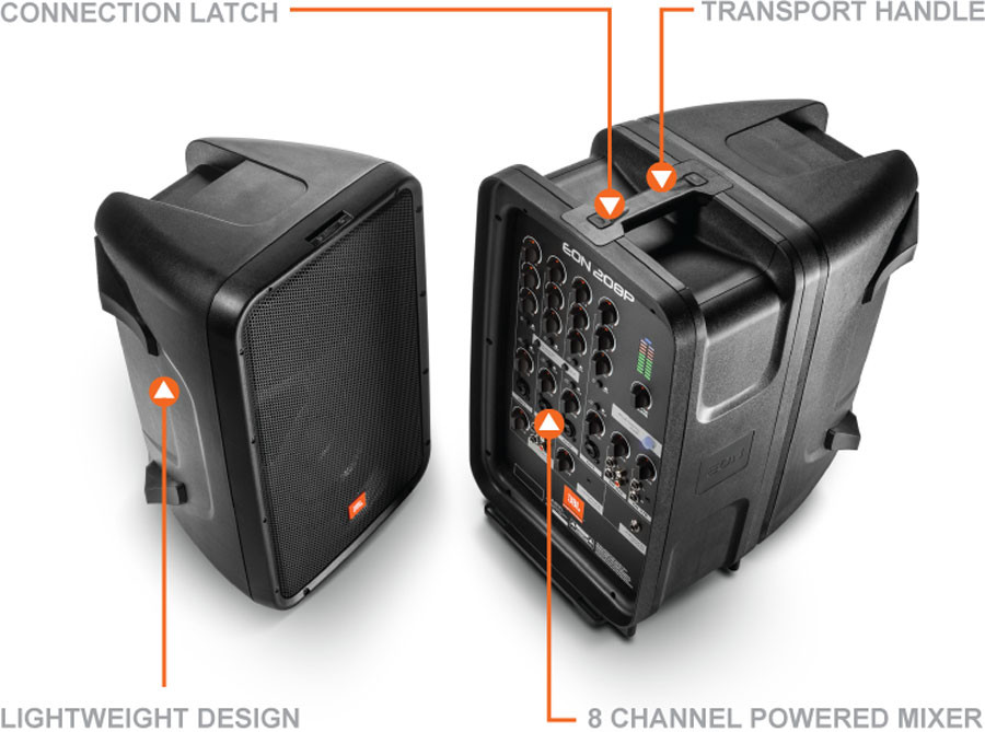 Portable Design EON208P puts professional audio within arm's reachliterally. The twin 8" speakers and 8-channel mixer clip together to form the most comprehensive, lightweight and portable PA in its class. Carry it in one hand with a guitar slung over your shoulder to play coffee shops and medium-size gigs. Or turn a backyard into the hottest nightclub around. With uncompromising JBL sound quality and effortless portability, you'll want to take it everywhere. The versatile enclosures facilitate stacking, pole mounting and use in monitor position.