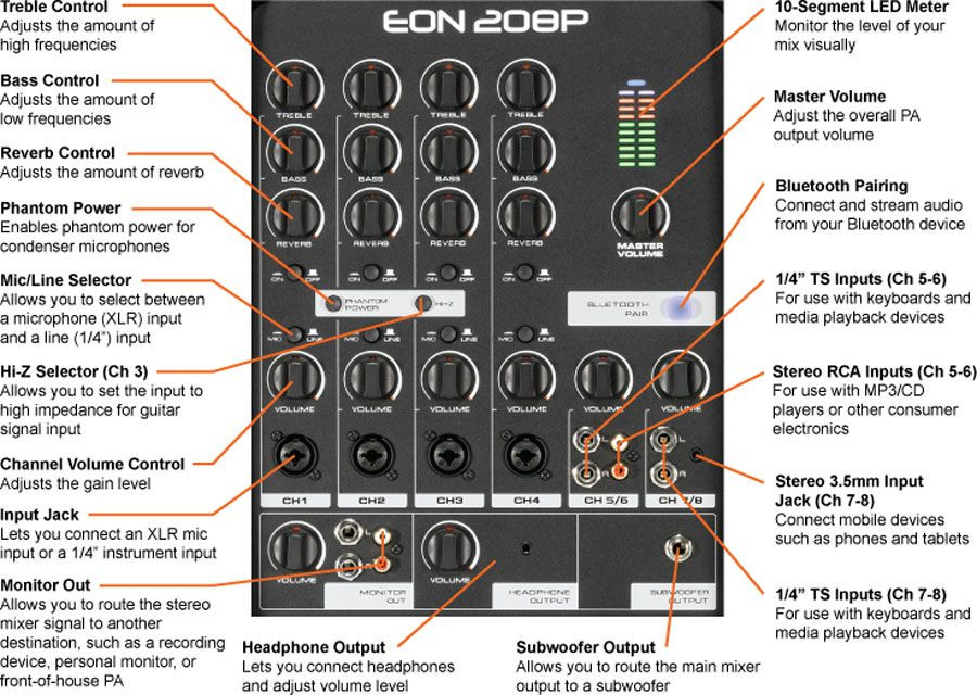 Stream Audio from Your Mobile Device Via Bluetooth With Bluetooth connectivity, EON208P lets you stream audio from your mobile device. Now you can DJ a party right from the dance floor, or play pre-recorded material for your meeting, worship event, or health cluball without the hassle of wires.
