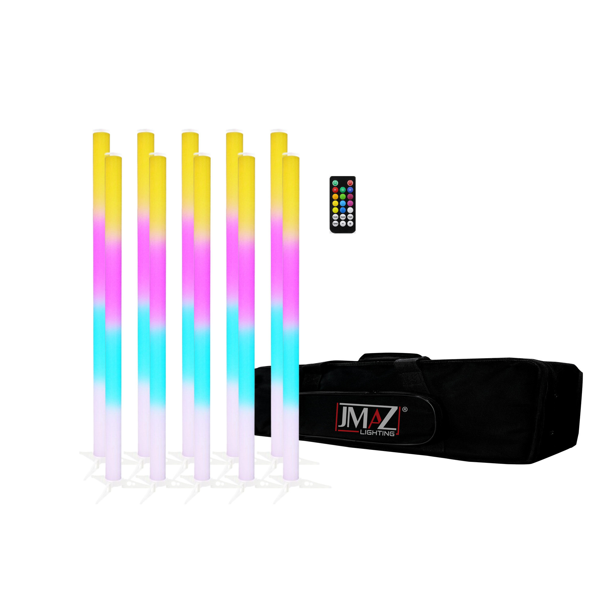 GalaxyTube is a color changing LED effect that can be mounted vertically, horizontally or free standing with the included easy fit feet. The rechargeable lithium battery offers a run time of up to 12 hours from a single charge, and with no power cables to connect you are free to set up the unit wherever you want. The tube will operate in chase, fade, static and sound active modes and is supplied with a handy IR remote. This package includes (10) Galaxy Tubes, a remote and a carry bag.