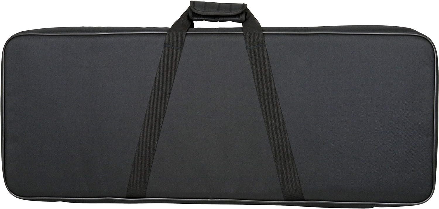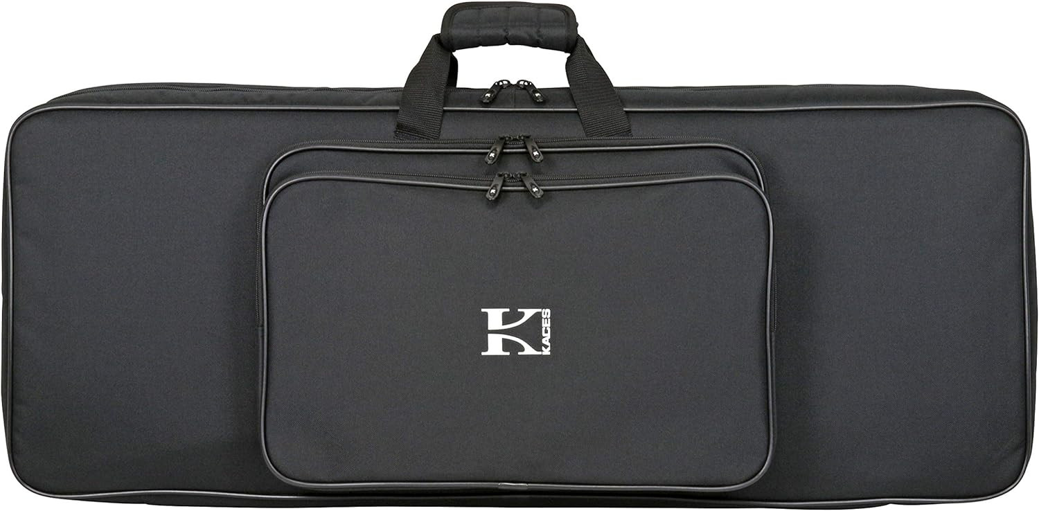 The Kaces Xpress Series keyboard bag features a water-resistant, luggage-grade, 600D polyester exterior, quilted grip handle, detachable shoulder strap, and dense, protective foam padding. There are two large, expandable pockets with room for a laptop or table top synth, cables, power supplies, sustain pedals, sheet music, microphones, and other accessories. Each bag has extra-strength stitching at tested stress points, silver, easy-pull zippers, and metal hardware.