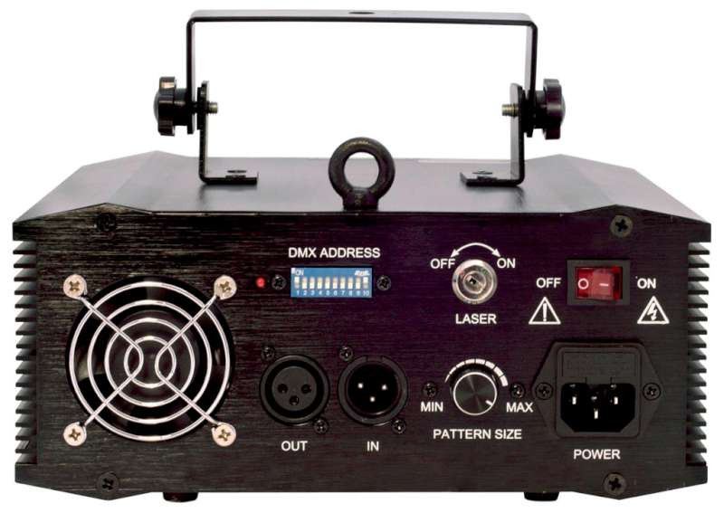 About 50 preset basic patterns, like layers, tunnels, fences, waves etc. can be controlled via DMX. A sound-to-light mode as well as a stand-alone mode are available too. For the sound-to-light mode the sensitivity of the integrated adjustable microphone can be altered.There is an on-off switch and a controller for projection size settings at the rear side of this device.