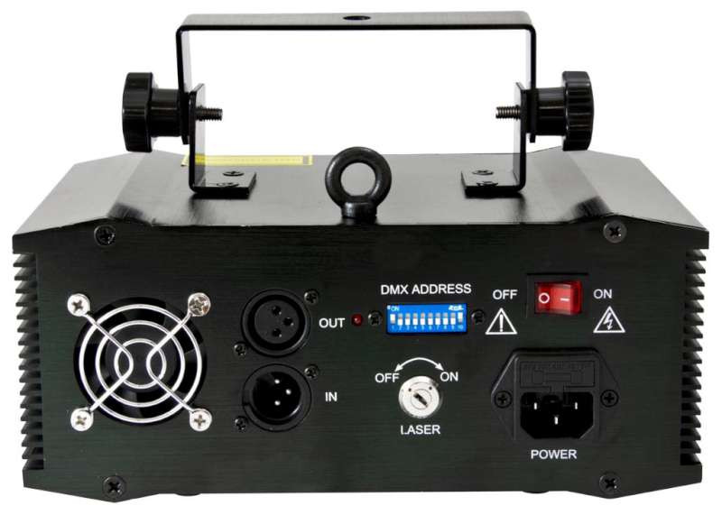 This laser system combines star effects with 3D like laser effects and results in various colorful patterns like dotted circles, helix visualizations, classical star effects etc. Due to the integrated glass gobos and the double laser outlet the effects get even extended. The patterns can be selected and modified via DMX. A sound-to-light mode as well as a stand-alone mode are available too. The sensitivity of the sound-to-light mode can be altered through an integrated adjustable microphone. There is an on-off switch and a key switch at the rear side of this compact device.