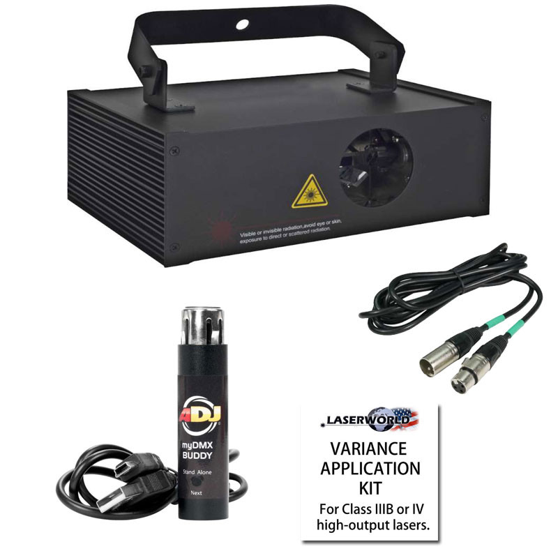 This Laserworld Ecoline laser package includes (1) EL-200RGY high-output laser, (1) ADJ MyDMX Buddy USB/DMX Dongle & DMX Software, (1) Laserworld Variance Kit and (1) 25ft 3-pin DMX cable.