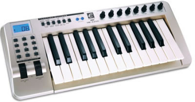 The Evolution MK-4251C is a 2-octave USB MIDI controller that's small enough to put in a backpack with your laptop. 8 assignable rotary knobs, 10 assignable buttons and 25 full-size touch sensitive keys make it a perfect compliment for controlling software like Reason and Live.