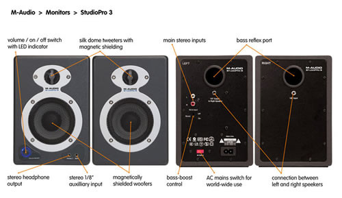 Professional StandardsMost small, inexpensive speakers simply don't have the design and material standards found in professional studio monitors. The StudioPro 3s change that, delivering the same M-Audio technology and attention to detail we put into our monitors used in studios around the world. The StudioPro 3s deliver a host of features not typically found in monitors priced this affordablyMDF rather than plastic cabinets, internal acoustic foam for better bass response, custom port design for optimal efficiency and more.