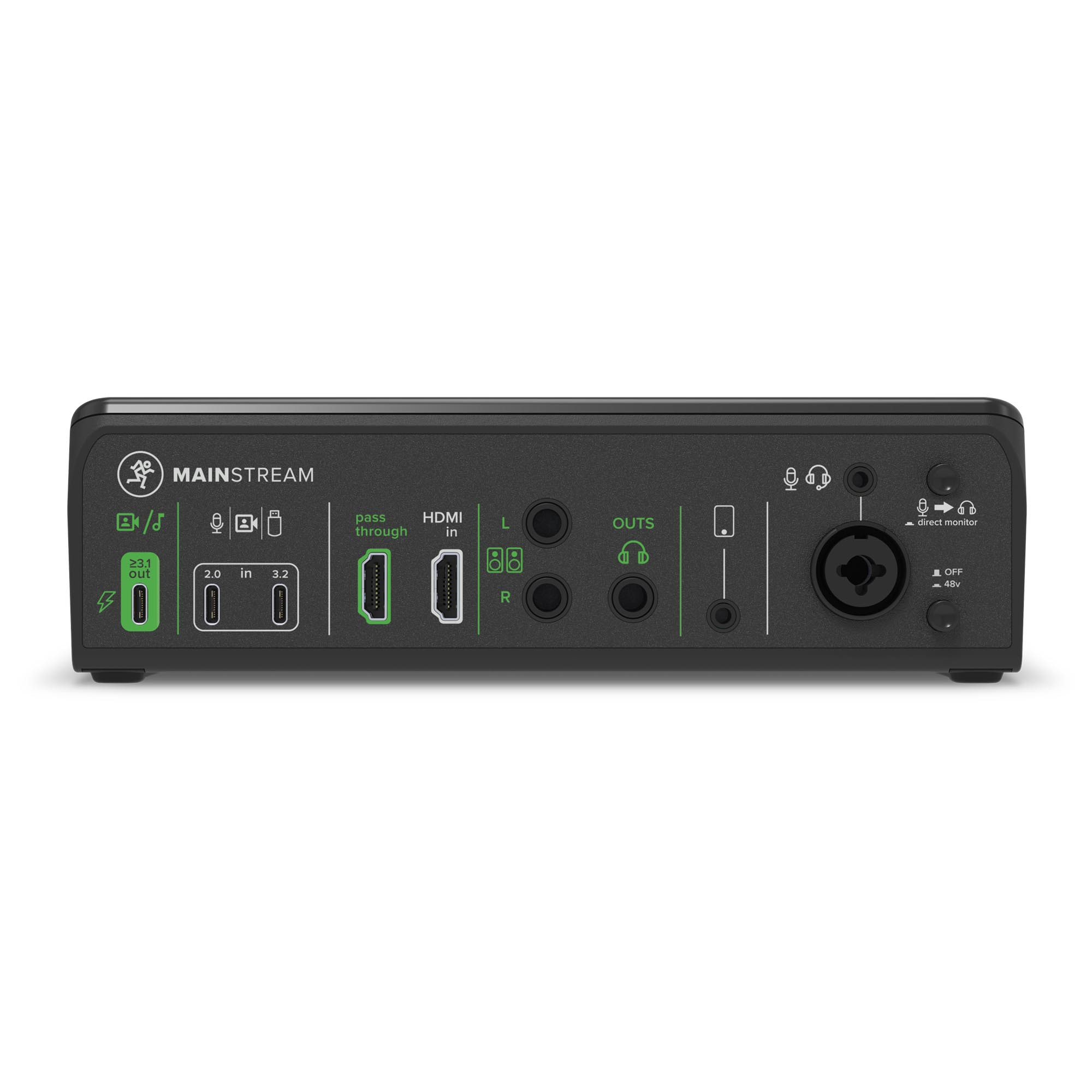 Analog inputs It wouldn't be Mackie without high-quality analog audio. In addition to the main mic input (+60 dB), MainStream includes a chat headset input, smartphone input for live streaming phone calls, headphone output and stereo line outs that are perfect for speakers.