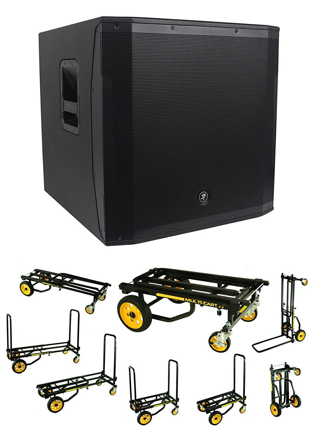 The Mackie SRM1850 1600W 18" High-Definition Powered Subwoofer delivers on Mackie's "Built-Like-A-Tank" SRM legacy in professional grade all-wood designs featuring enhanced Mackie digital processing providing new levels of SRM ruggedness, output, clarity and simplicity. This package includes a Rocxk n Roller R8RT equipment cart.