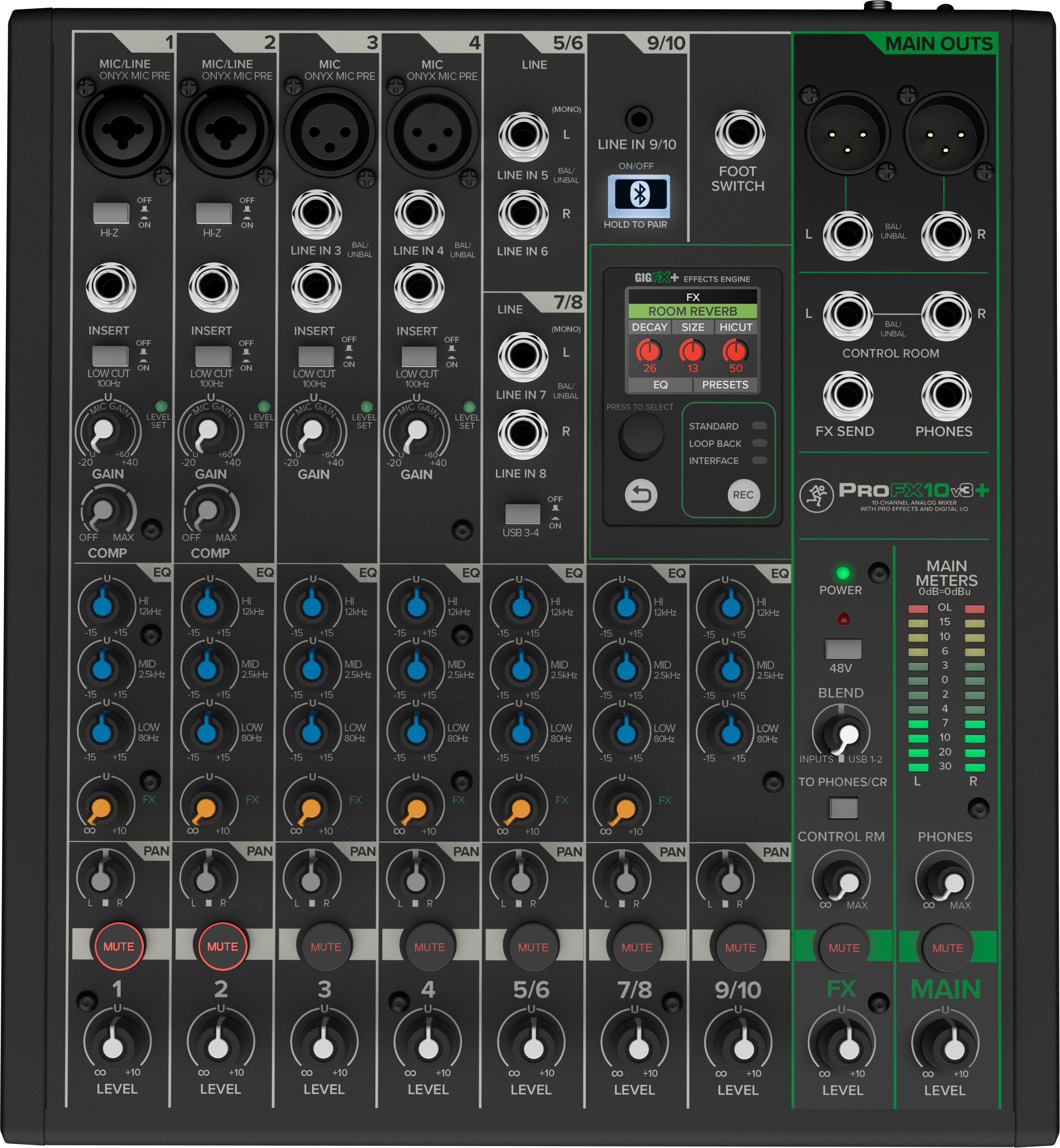 Mackie ProFXv3+ Series is a professional analog mixer and USB-C audio interface with powerful enhancements for studio-quality recordings and live streams. Capture your performance with Onyx preamps and channel EQ, add computer audio via loopback, bring in calls via Bluetooth and enhance your sound with upgraded GigFX+ effects on a color LCD screen.