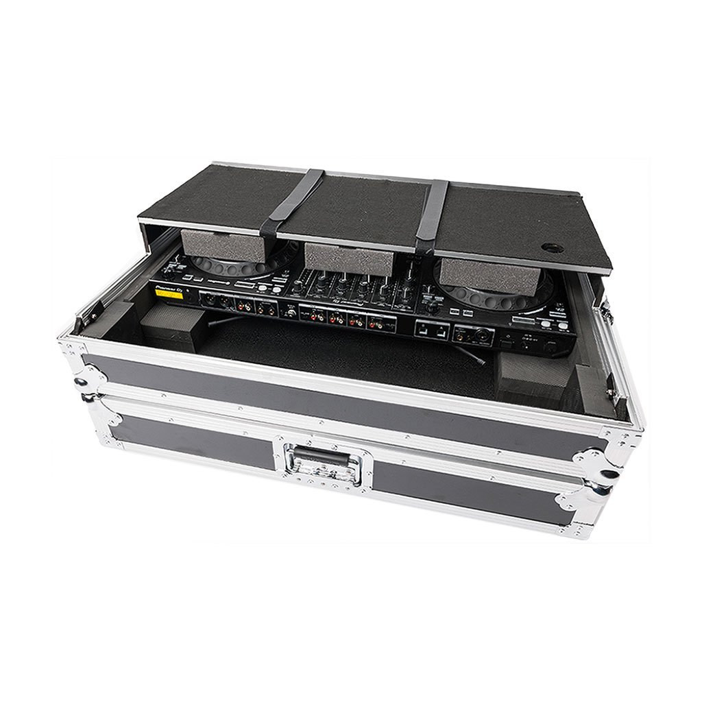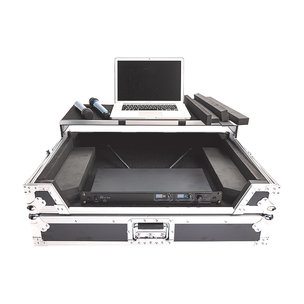 One size fits all! The new MULTI-FORMAT WORKSTATION XXL PLUS 19" is a heavy-duty road case for your DJ-controller and a 19'' rack mount device (1U) such as a wireless microphone system, power strip or storage drawer. The versatile design features several foam pads in various sizes to accommodate most current extra-large DJ controllers such as Pioneer DDJ-1000, Denon MCX-8000, Denon MC-7000, Roland DJ-808, Reloop Mixon4, Pioneer XDJ-RX2 or DDJ-SX3. The included 19" rack mounting brackets allow individually fastening of a 1U 19" unit (or smaller devices) at the front or rear underneath the controller. Thanks to the integrated gliding laptop platform and the convenient cable access port, the setup is ready for action in no time at all.