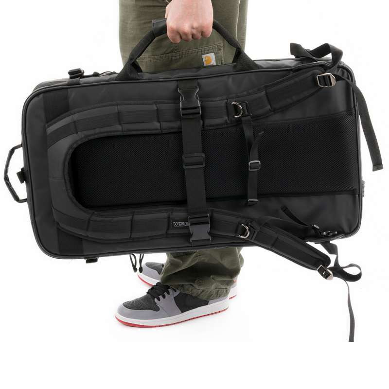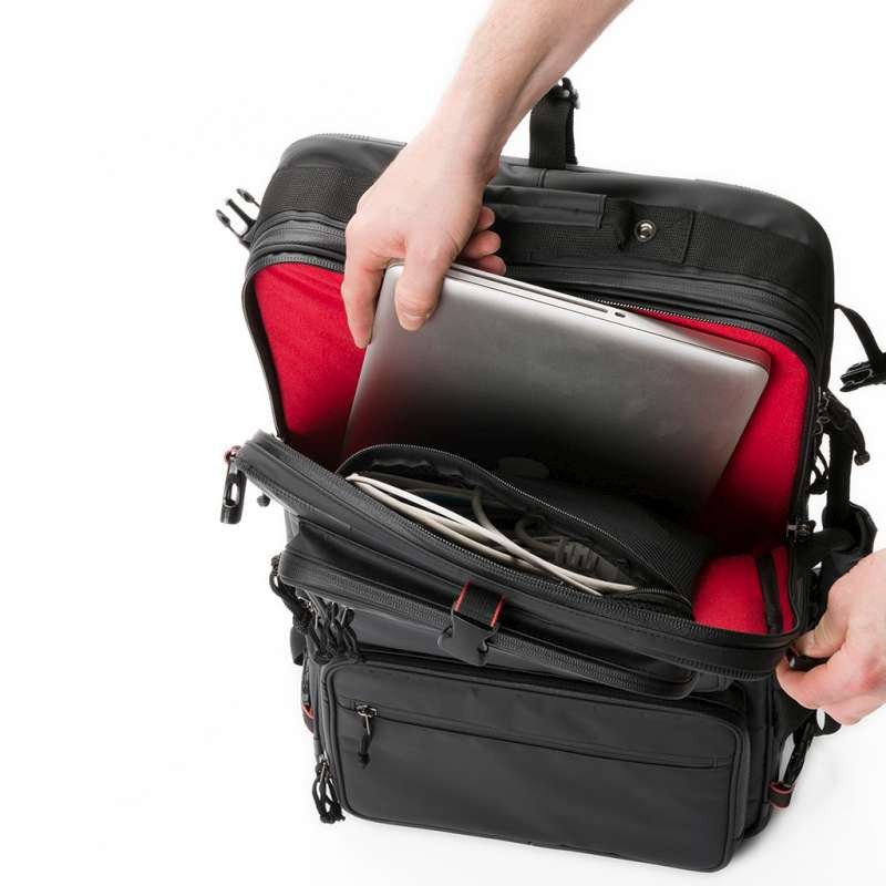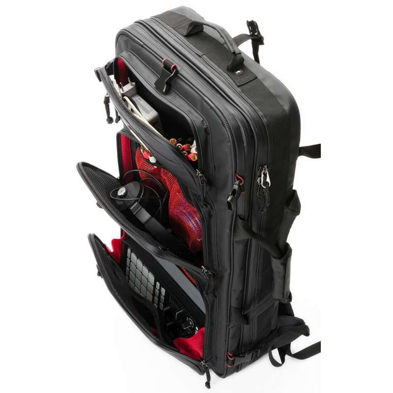 Another padded compartment is provided to hold a laptop up to 19" along with a flat-folding laptop stand and other small accessories which can be stowed in the included hanging pouch. There are also 3 large front pockets with several mesh compartments to hold plenty of additional gear like an iPad, small controllers, headphones, cables etc.