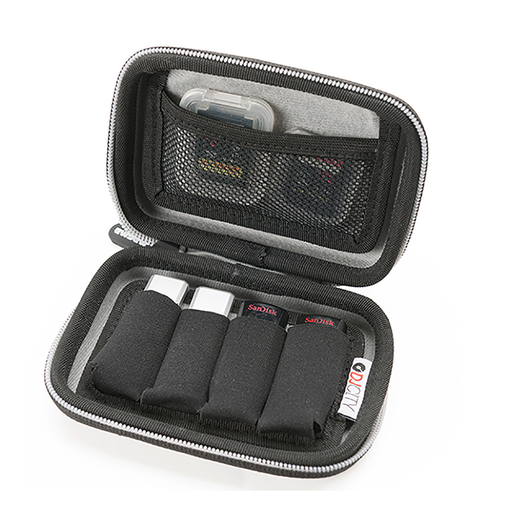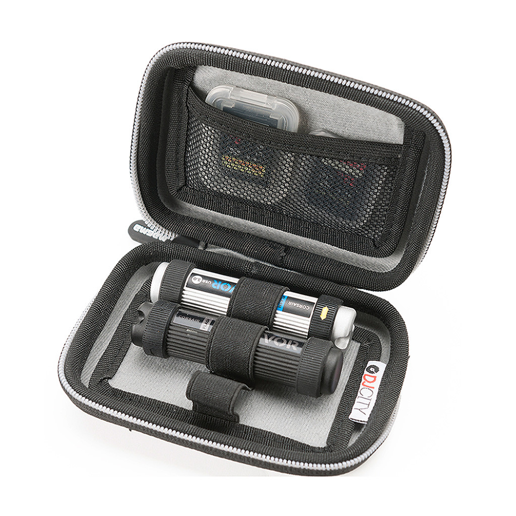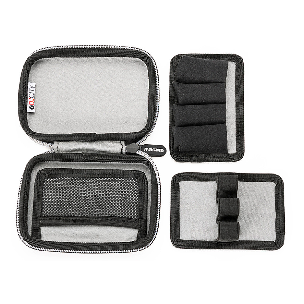 Magma teamed up with DJCity to introduce this rugged and compact organizer for your USB drives. Made from rigid EVA molded EVA Durashock and water-resistant Ballistic Nylon, it includes two removable inserts that optionally fit four regular-sized or three large Corsair Survivor USB drives. Small gadgets such as SD cards, ear plugs, headphone jacks or business cards can easily be stowed away in two additional mesh and lining pockets.