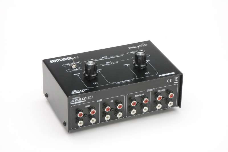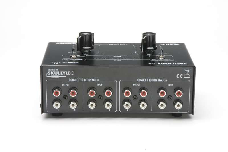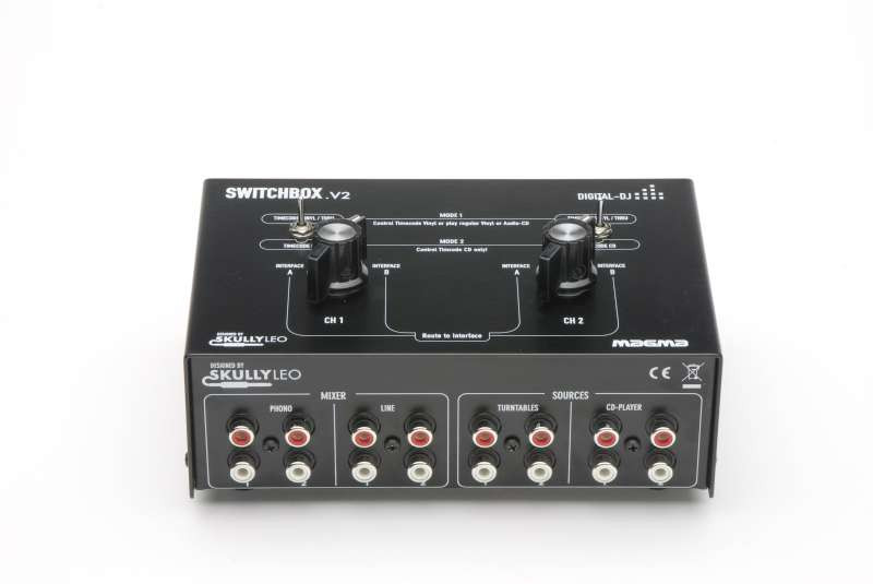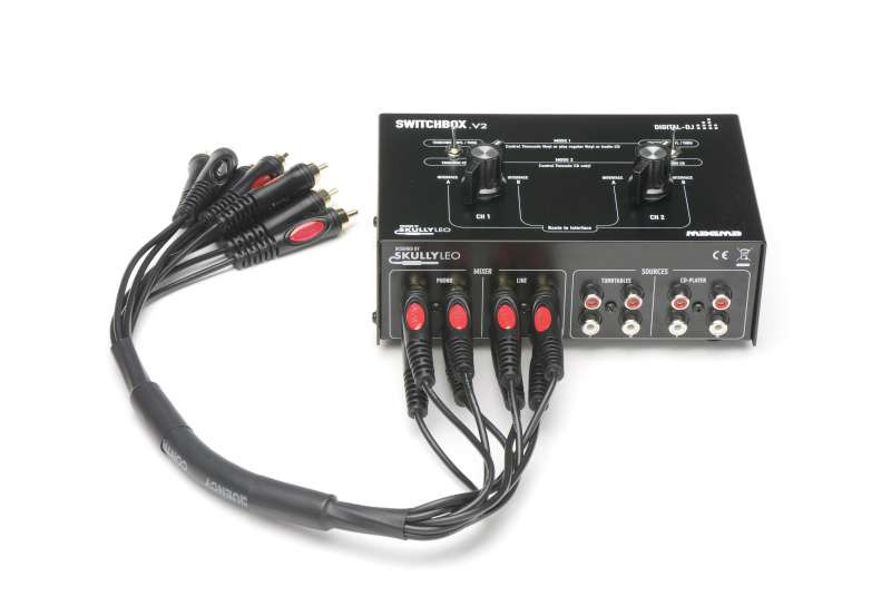 Thus, the MAGMA SWITCHBOX enables the so-called "Ping-Pong Style" at which 2 or more DJs are alternating after each song. So if there are 2 DJs performing with each of their laptops (e.g.: DJ A: Traktorl Scratch und DJ B: Serato), the turntables can easily be routed towards the desired audio source.