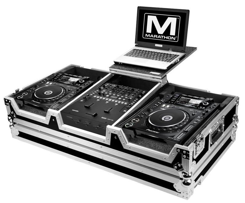 Case designed for 2 large format CD players and Rane Sixty-Two mixer (and similar). Comes with low profile wheels and laptop shelf.