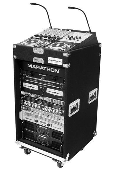Carpet Case that holds 10U Slant Top, 16U Bottom, Recessed Mount Hardware with 3 caster plate and front brakes. MARATHON Carpet Cases Feature 10U slant rack rail top, Durable carpet covered wood composite construction, Chrome heavy duty metal recessed handles, latches, ball corners, front and rear bumper rails and 8 corner straps. User friendly removable access doors. Stackable top lid with two piece hinges.