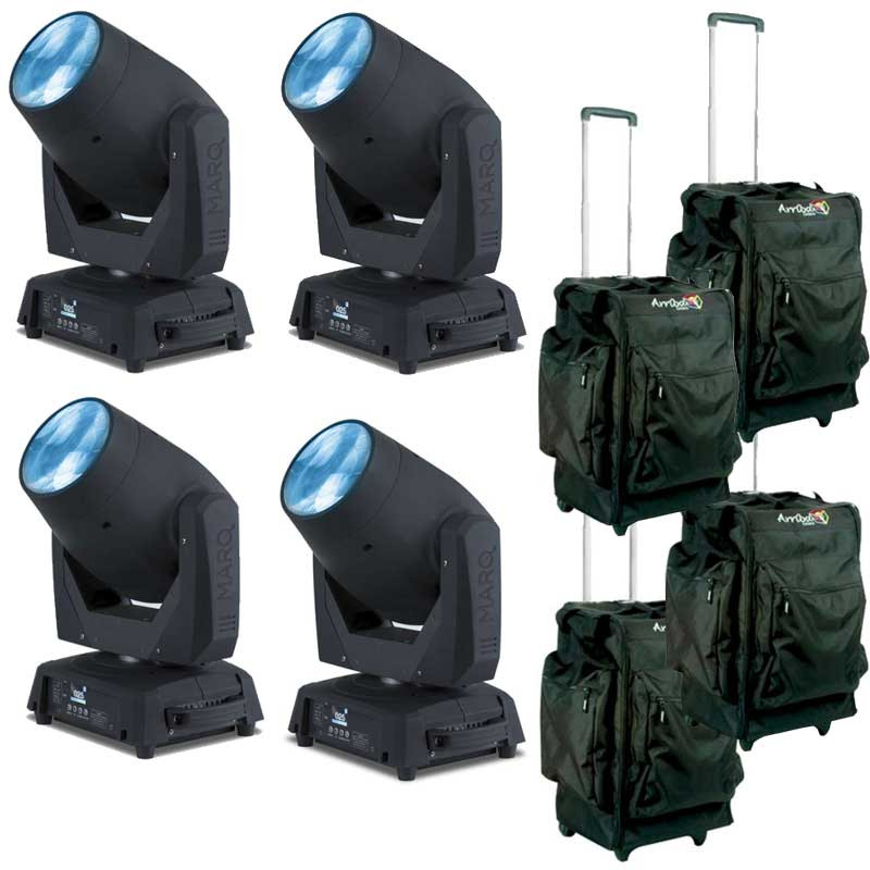 This Marq Gesture Beam 400 package features (4) Marq Gesture Beam 400 moving heads and (4) durable protective transport cases.