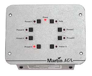 This new 7 pre-set remote controller is a handy user-interface for smaller exterior installations. Seven different pre-sets (cues) can be programmed via the MPBB1 directly into the Martin Exterior 600 or Exterior 600 Compact's memory. Once the remote controller is connected, the 7 presets can be conveniently called up on the MC-X's buttons. Furthermore the Exterior's stand- alone program can be activated as well. This remote controller also has the capability to remote control the Martin LightJockey and Martin ProScenium controllers, thereby allowing for a very easy user-interface for complex installations.
