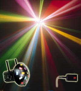 Two effects in one! You decide which effect is right for the music! The first effect has 30 multi-colored beams scanning around the room. With the click of a remote switch, it changes to 15 broad fan beams spinning clockwise and counterclockwise to the beat of the music. Sound active. Includes remote switch.