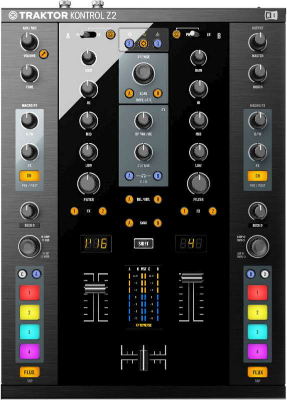 TRAKTOR KONTROL Z2 is the world's first 2+2 DJ control mixer. Built tough for pro club use, the Z2 excels both as a state-of-the-art club mixer alongside turntables and CDJs, and as the hub of an advanced setup of Remix Decks and controllers. All-new Macro FX and Flux Mode in the latest TRAKTOR software expand your creative arsenal. And the heavy metal, standard installation-height chassis, sturdy RGB control buttons, and Innofaders' assure rock-solid dependability. Whatever your style, however you play, welcome to the future of mixing.