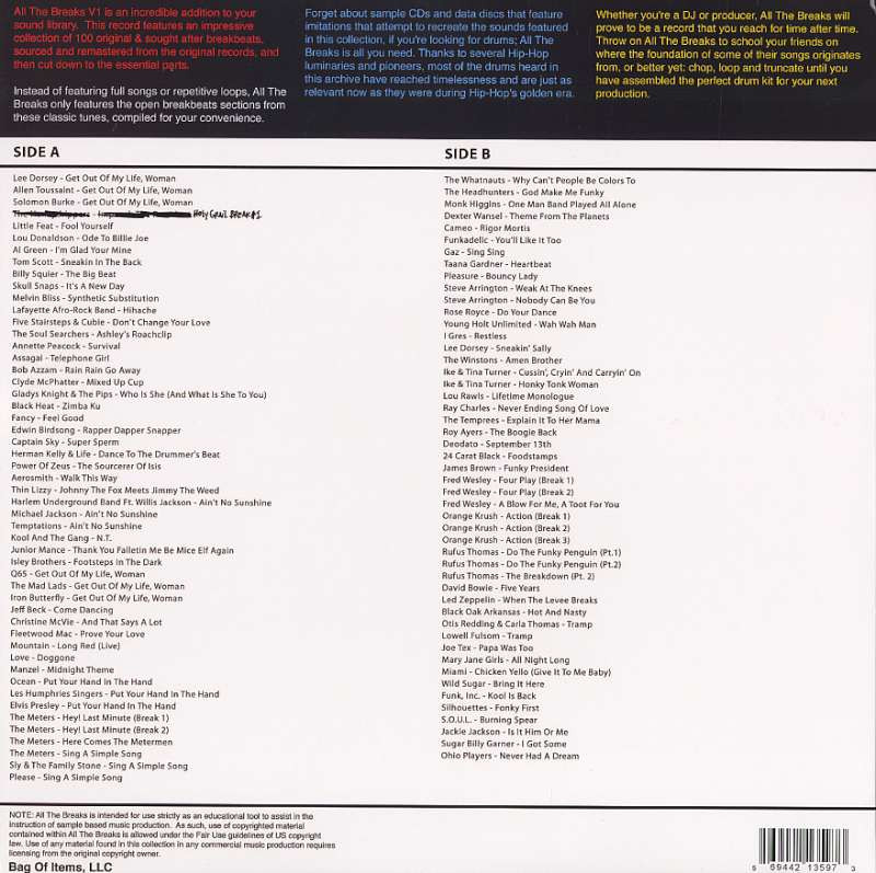 All The Breaks V1 is an incredible addition to your sound library. This record features an impressive collection of 100 original & sought after breakbeats, sourced and remastered from the original records, and then cut down to the essential parts.