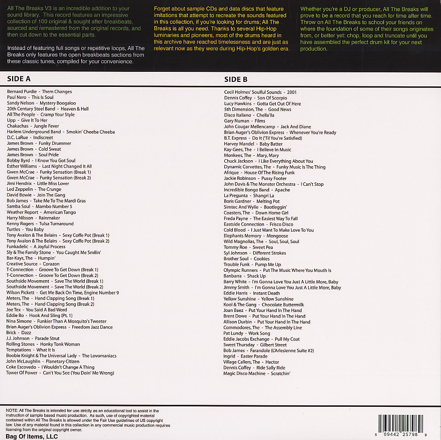 All The Breaks Volume 3 is the third volume with 100 more drum break snippets. This record features an impressive collection of 100 original & sought after breakbeats, sourced and remastered from the original records, and then cut down to the essential parts.