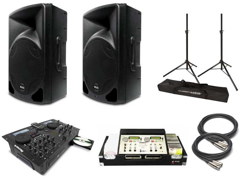This Numark/Alto Professional bundle includes (1) Numark CDMIX-Bluetooth all-in-one CD/Mixer System, (1) Odyssey CNMCM1CD CDMIX case, (2) Alto TX12 12" powered speakers, (2) Ultimate Support Jamstands Speaker Stands, (1) Dual Speaker Stand protective carrying bag and (2) 25' XLR-XLR powered speaker cables.