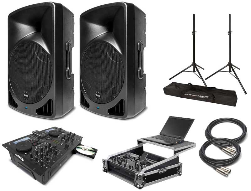 This Numark/Alto Professional bundle includes (1) Numark CDMIX-Bluetooth all-in-one CD/Mixer System, (1) Odyssey FZGS8CDMIX CDMIX case with glide-style laptop shelf, (2) Alto TX15 15" powered speakers, (2) Ultimate Support Jamstands Speaker Stands, (1) Dual Speaker Stand protective carrying bag and (2) 25' XLR-XLR powered speaker cables.