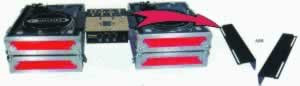 Accessory Battle Bridge adapters mount a mixer between two turntable cases.