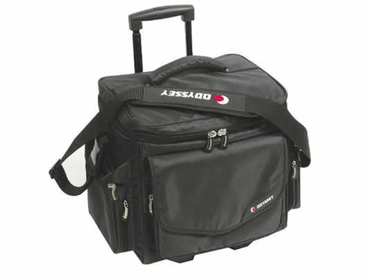 This incredible bag was specifically designed for digital DJs in the laptop arena. It can comfortably hold a laptop, LPs, interfaces (i.e. Serato, Torq, etc.) headphones, mics, needle cases, record cleaner and other digital essentials. Flap features zippered pockets, while the bag features two tall velcro pockets. Outside flap pockets are great for phones, PDAs, or quick access items. Get to your next gig in style - all in one bag! Includes wheels for easy transport.