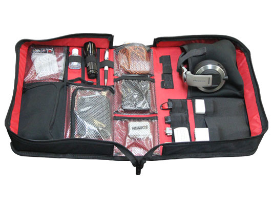 The Red' Series BRLDJA accessory organizer is ideal for the needs of today's on-the-go DJs who need only the minimal essentials for their performances. The stylish red and black interior is designed with multiple zipper and elastic compartments, pouches, and holding bands, a highly efficient storage space for small accessories such as hard drives, USB hubs, headphones, flash drives, SD cards, flashlights, cables, and adaptors just to name a few. Two easy access exterior pocket sections on either side are great for tablets and other larger gear. The BRLDJA, a high quality piece perfect for high pace DJs.