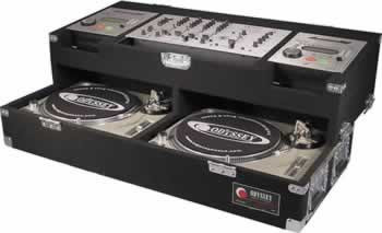 Top holds (2) American DJ PRO-DJ1, 2 or 3 CD players and 19" rack mixer of up to 8-spaces. Bottom section holds 2 turntables with foam padding.