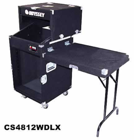 Our patented slide-style cases are thoughtfully designed and solidly built. Functional, sliding vertical rack space (4 spaces) above the slanted mixer area (8 spaces) for tape decks, EQ's, etc. The bottom section has 12 vertical spaces. Carpeted finish and heavy-duty recessed hardware. The patented EdgeGuard (bottom edge) prevents direct impact damage to the case. Front cover converts into a side table with flip-down legs mounted below. Includes wheels for easy transport.