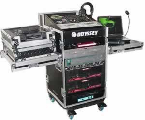 Brand new from Odyssey, this rack case converts into a full work station for all your professional DJ needs. 3/8" LAMINATE BLACK Flite Case 11u slant top, 16 u bottom with wheels and two tables.