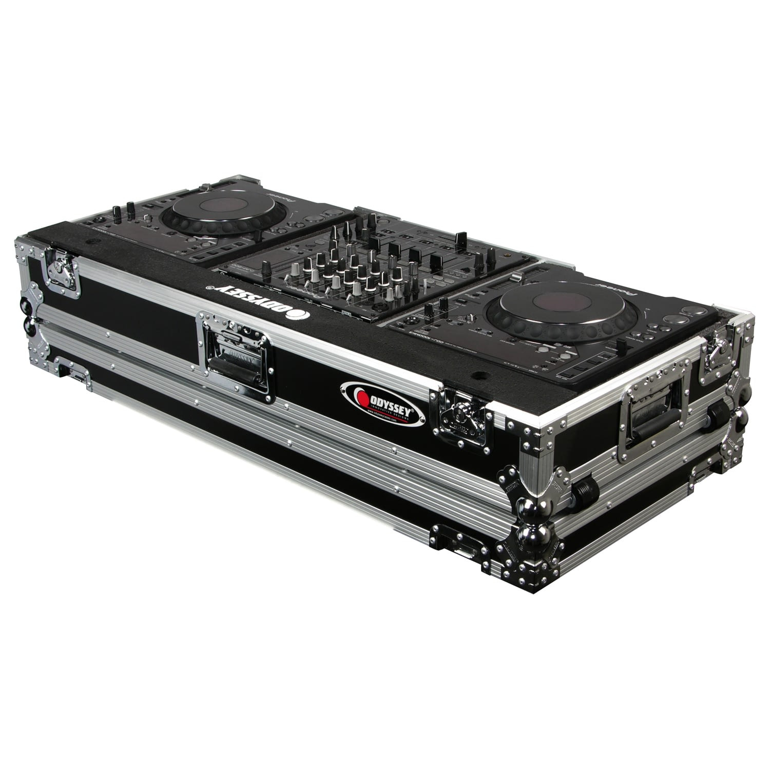The FR12CDJWE Flight Ready CD/digital media player DJ Coffin holds two large format tabletop CD/media players and one 12" format DJ mixer. These ATA Rolling Coffins feature rugged built-in wheels, heavy duty spring-loaded latches, stackable ball corners, and front access panels. Cabling is clean and easy through convenient access ports throughout.
