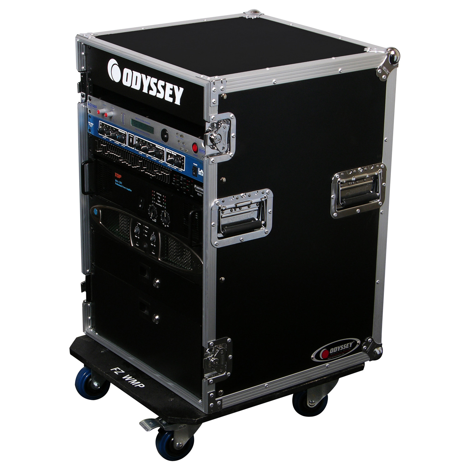 FR16WE Flight Ready Medium Duty 16-space Amplifier Rack w/ Wheels is made of either 1/4" or combination of 1/4" and 3/8" black wood laminate construction with all chrome plated steel hardware for that look and feel of a true ATA flight case.
