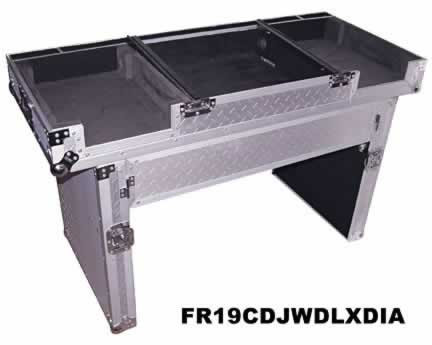 Complete diamond-plateed mobile DJ setup in minutes! Transporting your 19 inch mixer (8 spaces total) and two CD players couldn't be easier. Interior is padded top, botton and sides. The lid actually converts into a stand, eliminating the need for an extra stand. It even has wheels on one edge to roll your case with ease. This case is universal-fit, and will carry most front-loading CD players.