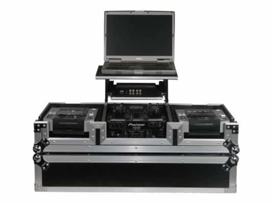Odyssey Flight Ready Glide Style Coffins holds two medium format tabletop CD players, one 10" mixer and a laptop. Also features a second shelf specially designed to house a Serato, Torq, hard drive, and many other audio interfaces.