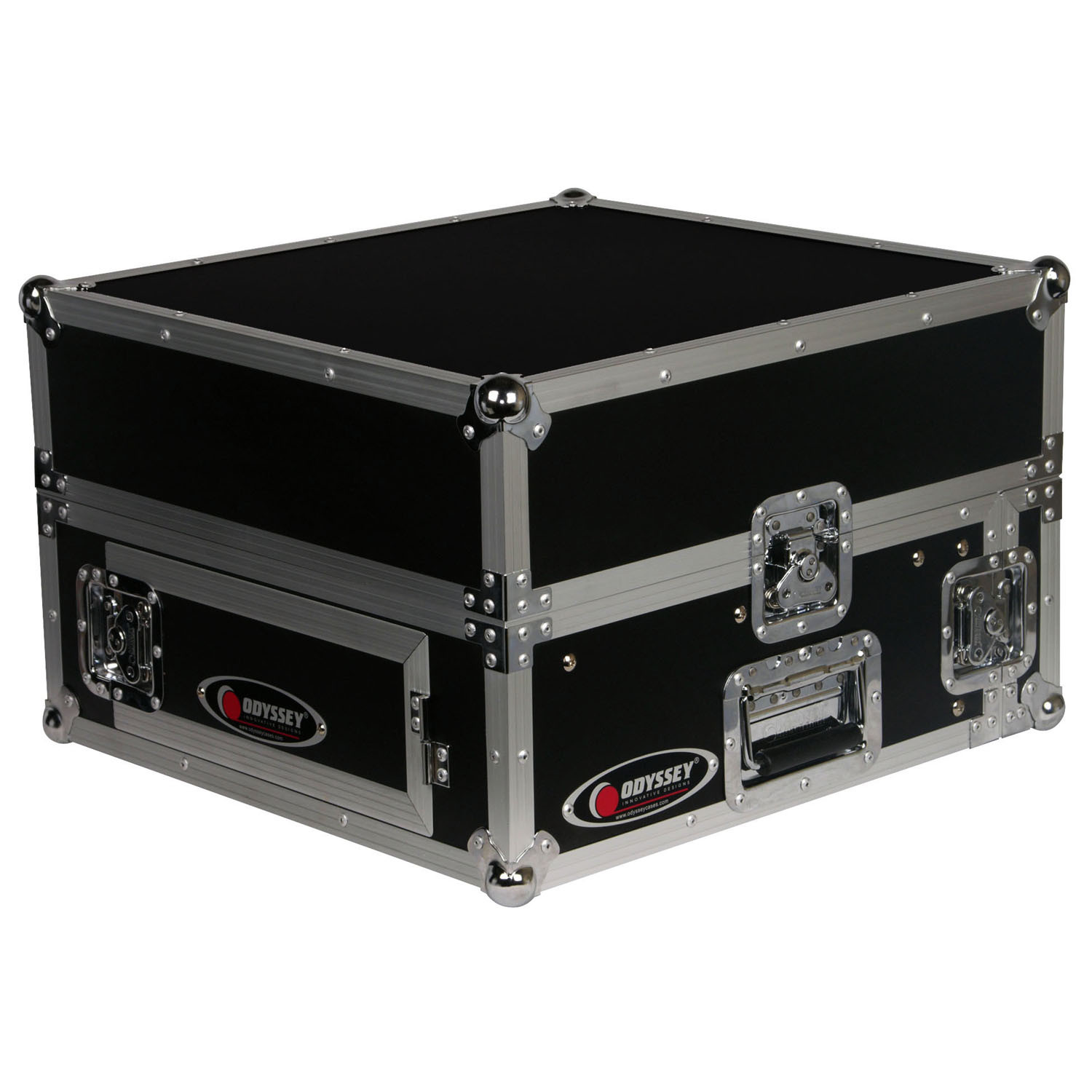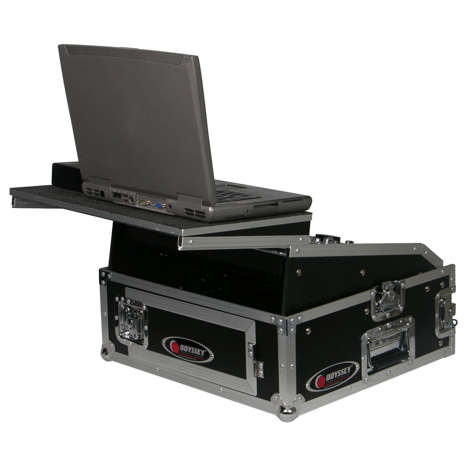 Our FRGS802 features a sliding laptop platform mounted on a traditional case. At your gig, set your laptop on the carpeted platform shelf surface, plug in and you're ready to go. Slide it forward to use your laptop. Slide it back to use the mixer section underneath.